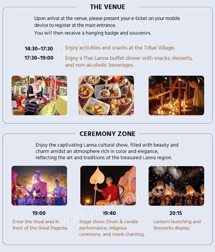 • Bởi vì hoạt động đọc kinh cầu nguyện và thả đèn trời là phần quan trọng trong Phật giáo nên du khách tham dự cần tuân thủ hướng dẫn của người dẫn chương trình một cách nghiêm ngặt.